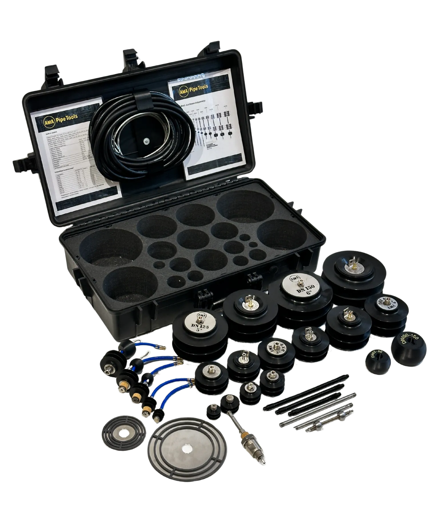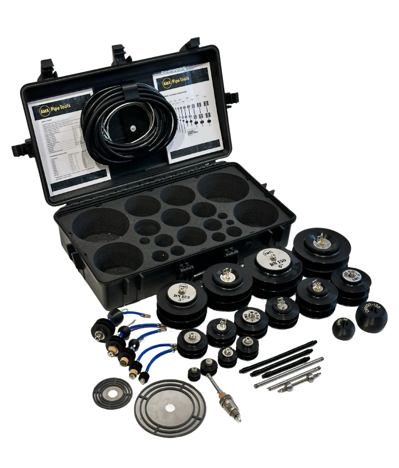 - Sarja sisältää silikoniset kaasutustulpat, koot DN20 – DN150 (3/4“- 6″)