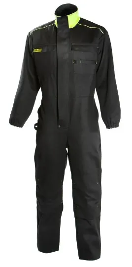 Rintataskut, oikeassa vetoketju, esiin otettava vaaka/pysty henkilökorttitasku, etutaskut, joissa läpimeno omille taskuille, takatasku, mittatasku. Polvisuojataskut. Kuminauha takana vyötäröllä. Tarvike- ja vasaralenkki. Etulista. Joustava hihansuu. Palosuojatun puuvillakankaan väri haalistuu pesussa.