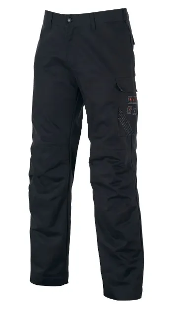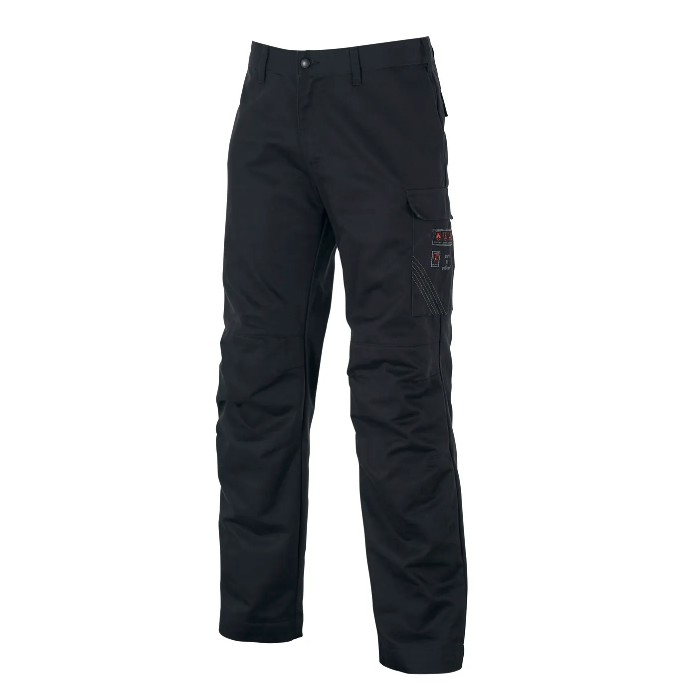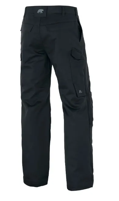 Musta, palosuojattujen tuotteiden mallisto. Näissä housuissa on tavalliset taskut, kaksi takataskua ja reisitasku.